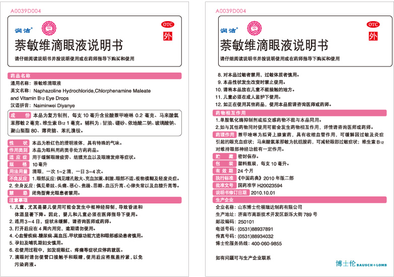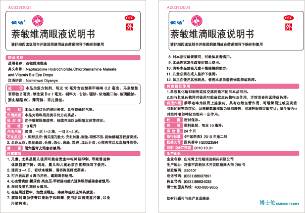 红润洁滴眼液:本品为复方制剂,每支10毫升含盐酸萘甲唑啉0.2毫克、马来酸氯苯那敏2毫克、 维生素B